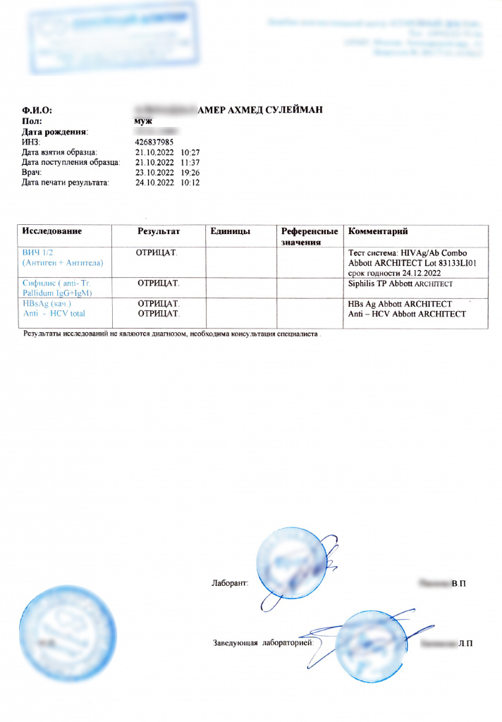 Наш медицинский центр предлагает услугу покупки анализа на ВИЧ, RW(сифилис), Гепатиты. Мы обеспечиваем быстрый и удобный способ получения необходимых анализов без лишних хлопот. Все, что вам потребуется - это предоставить необходимые данные через WhatsApp, и наши специалисты сразу же приступят к работе. Наша цель - сделать процесс получения анализов максимально простым и удобным для вас.